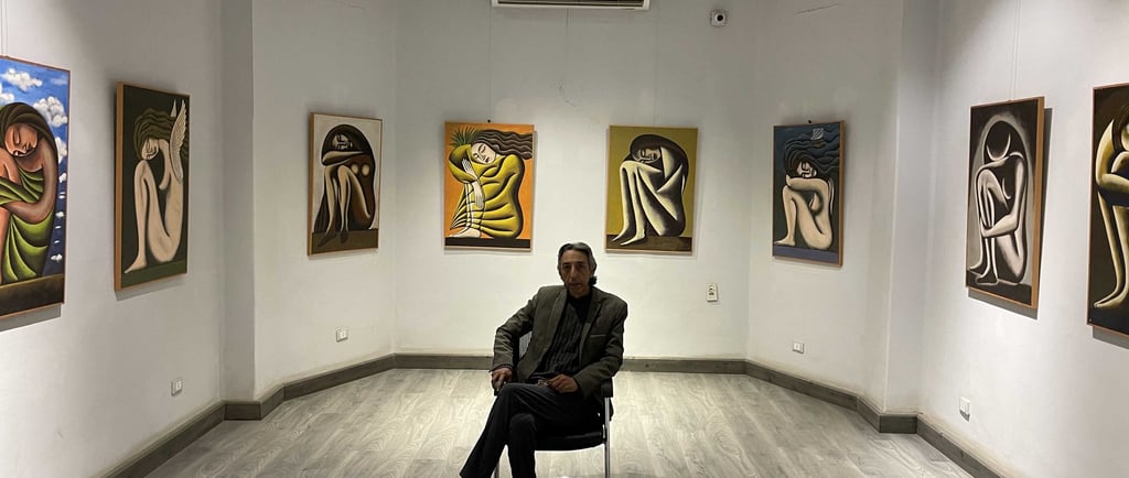 Hesham Nawar among his paintings of Sleeping Beauties.