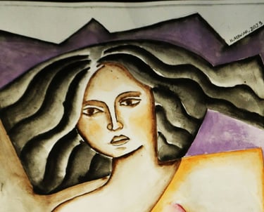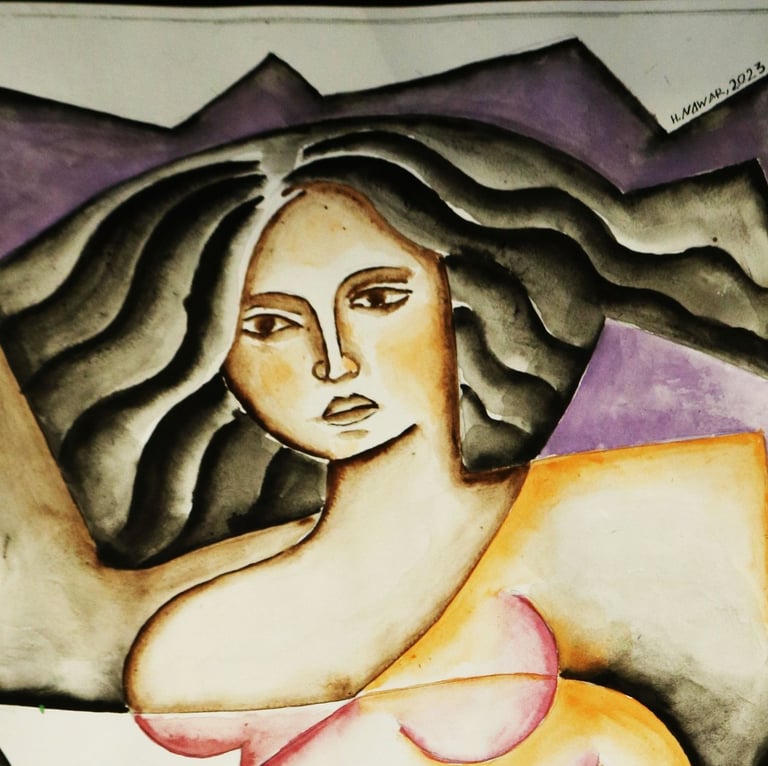 Nawar’s visual vocabulary relies heavily on symbolism, a hallmark of his artistic voice. A flower clasped in the girl’s hand might represent the tenuous relationship between nature and the human soul, while another piece integrates her flowing hair into seascapes, blending identity with the eternal. A sailboat drifting through these waves invites interpretations of journey, longing, or quiet departure.