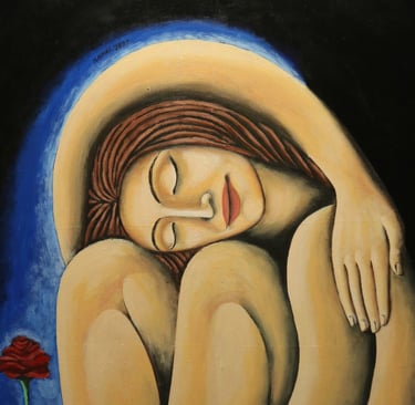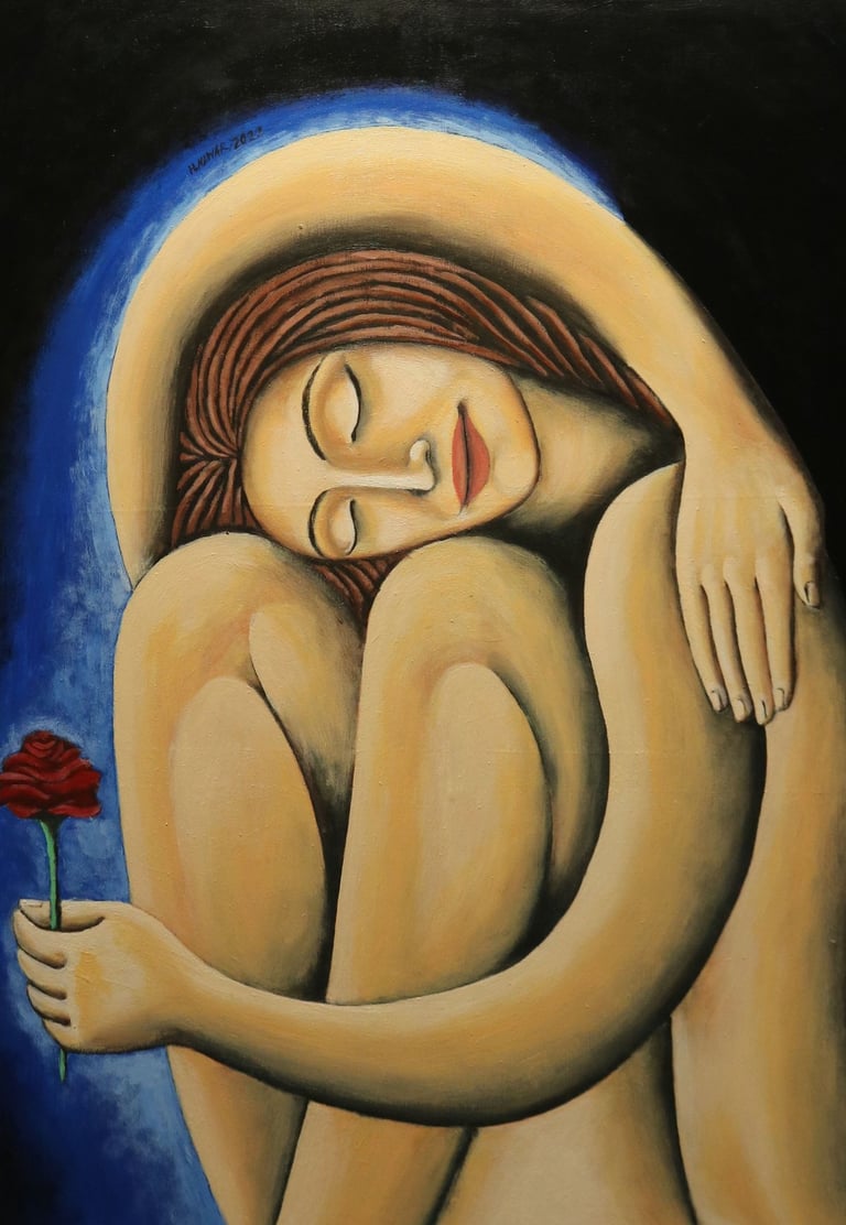 The result is Sleeping Beauties, a deeply symbolic and emotionally charged series of paintings that present the female figure in a recurring fetal pose. Far from static, each iteration transforms through variations in texture, background, and light. Nawar presents the female body not as an object of desire, but as a vessel of inner life—haunted, dreaming, enduring.